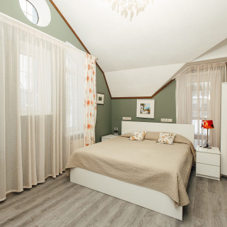 На первом этаже коттеджа ВИП-коттедж Делюкс организована просторная гостиная с большой кроватью, обеденной группой и сауной, в которой Вы сможете попариться в любое удобное время. Красивое оформление интерьера в легких непринужденных пастельных тонах и качественная мебель располагают к приятному беззаботному отдыху, а грамотная планировка номеров создает необходимую атмосферу теплоты и уюта.